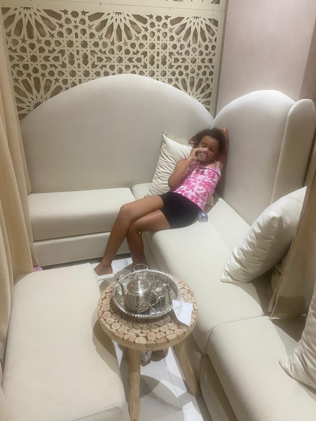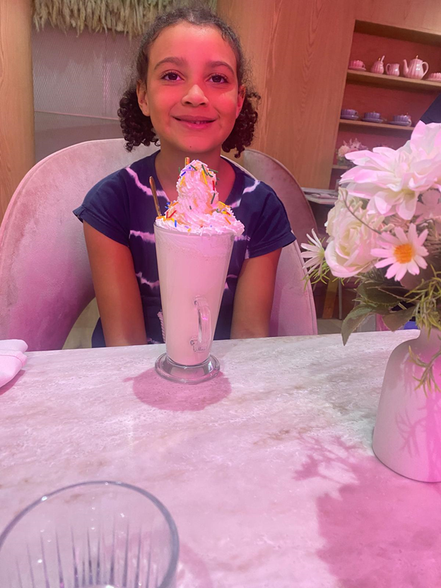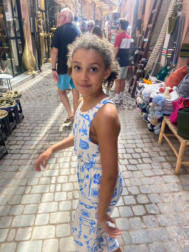 “My favourite place to go in Marrakesh is ‘Besties Bakery’ in Gueliz. They have the best milkshakes and cakes, it is so pretty, everything is pink. After I had milkshake and cake, I went into the hammam downstairs. It was so relaxing, and my skin was really soft afterwards, the ladies gave me mint tea as well. My favourite thing to do is swimming. It was warm in October so I could swim a lot. I went to the souk and a man showed me a traditional type of makeup that is made from petals and pomegranate, mum let me buy one and I bought a little golden camel with jewels on it for my uncle. The food I enjoyed the most was chicken tagine.”